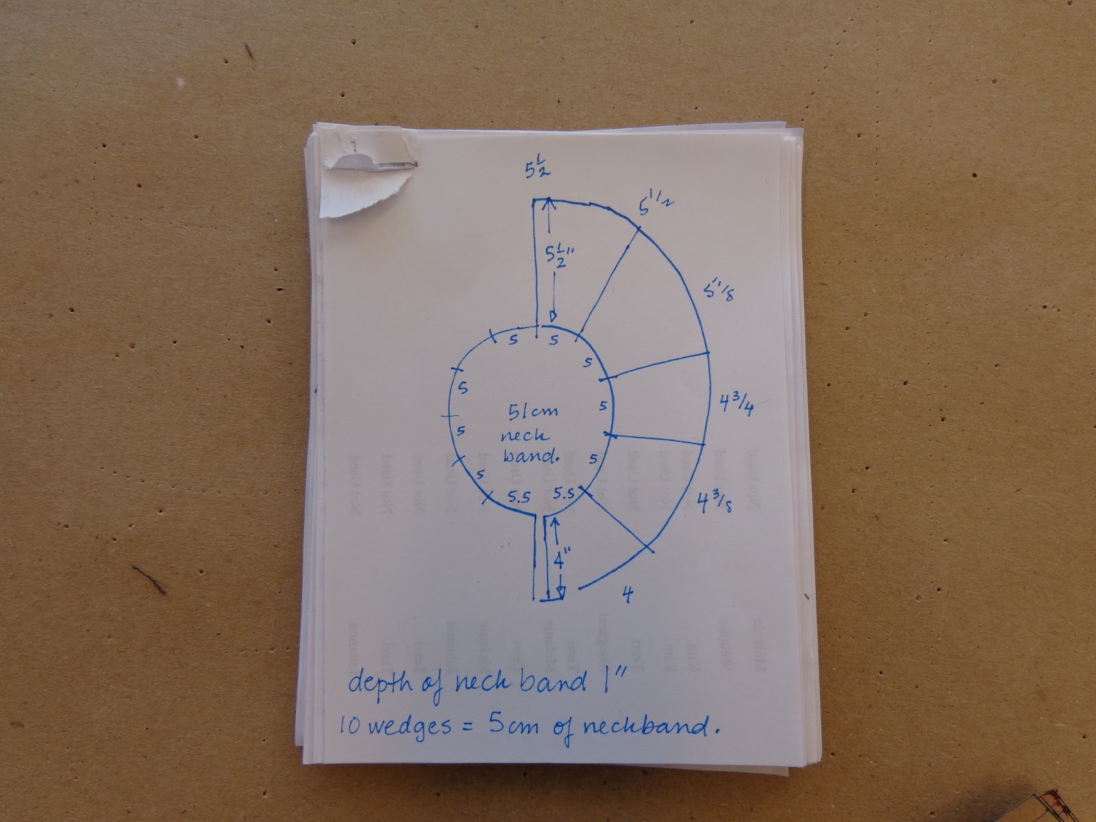 So I divided the neckline into sections and determined the depth of each section. I made five different "wedges" to correspond with those depths. I then figured out how many wedges would be needed to fit into each section of the neckband and drew them out as partial circles.